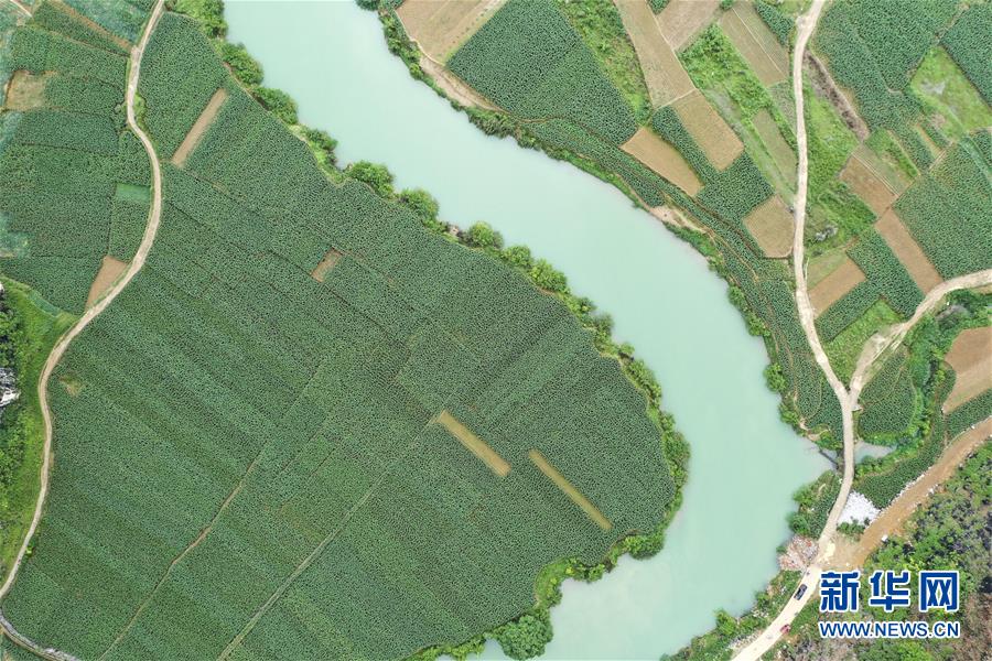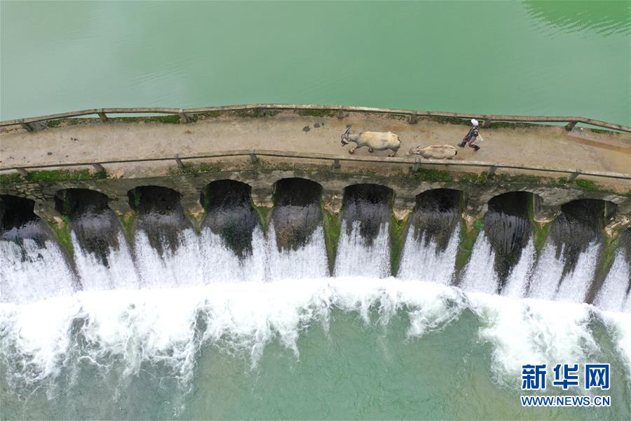 4月23日,在廣西隆安縣南圩鎮(zhèn),農(nóng)人趕著牲畜走過一座小橋(無(wú)人機(jī)照片)。新華社記者周華攝