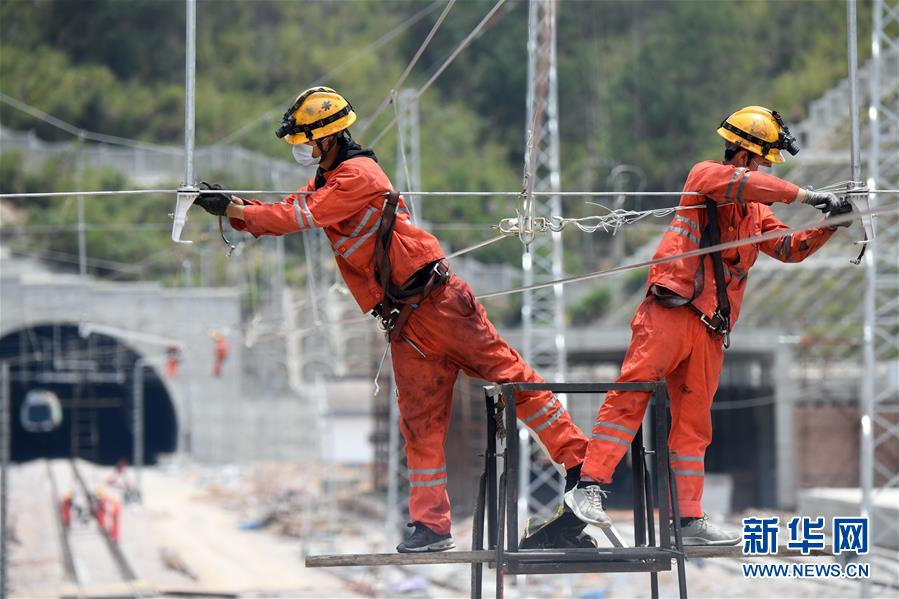 4月25日,在福建省寧德市屏南車(chē)站,施工人員開(kāi)展接觸網(wǎng)調(diào)整作業(yè)。中鐵電氣化局集團(tuán)上海公司推動(dòng)衢寧鐵路福建段通信工程、信號(hào)工程、電力工程、電氣化工程各環(huán)節(jié)協(xié)同復(fù)工復(fù)產(chǎn),目前來(lái)自河北、河南、四川等國(guó)內(nèi)10個(gè)省的900多名員工返崗就業(yè)。衢寧鐵路北起浙江省衢州市,南至福建省寧德市,全長(zhǎng)379.2公里。新華社記者彭張青攝