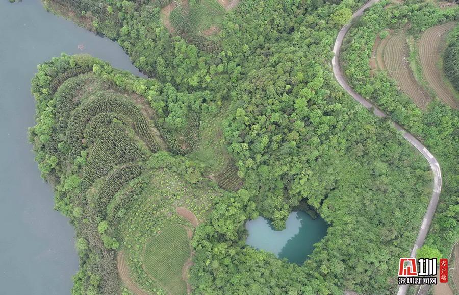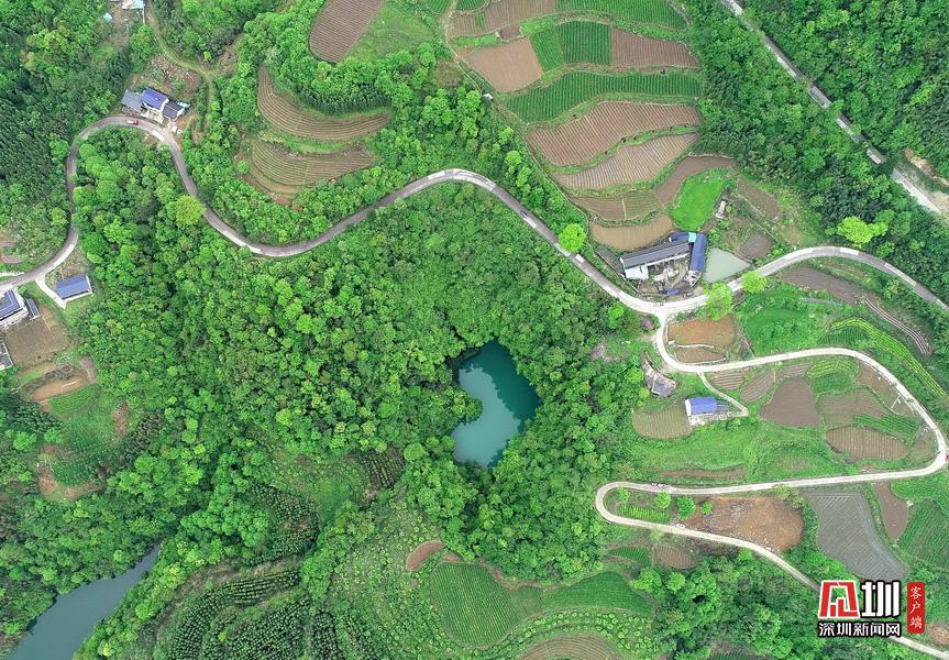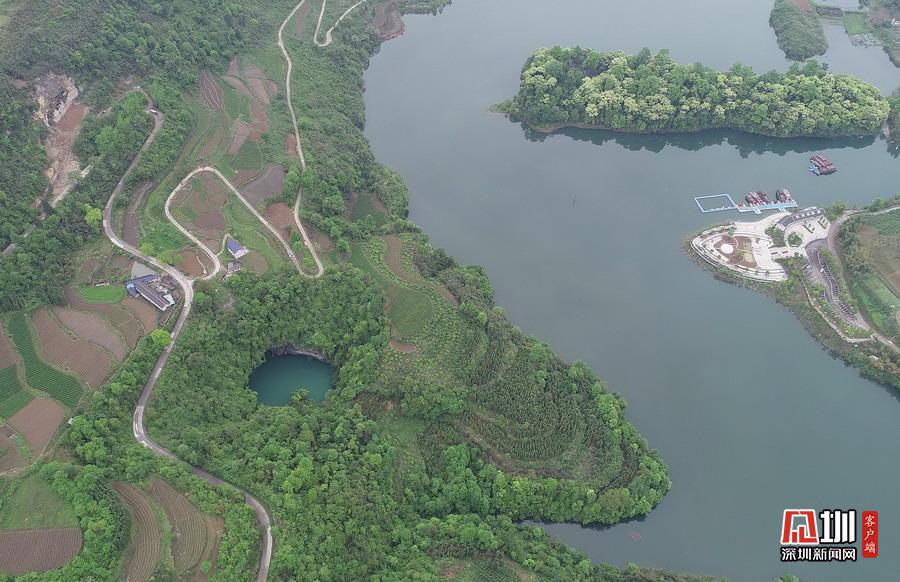 2020年4月24日,在湖南張家界市永定區(qū)“百里畫廊”茅巖河景區(qū)拍攝的“天坑心湖”。(無(wú)人機(jī)拍攝)