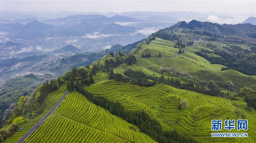 俯瞰鹿鳴茶海一角(4月28日無人機(jī)照片)。四川省珙縣的鹿鳴茶海,常年云霧繚繞,茶壟依山分布,美不勝收。新華社記者江宏景攝