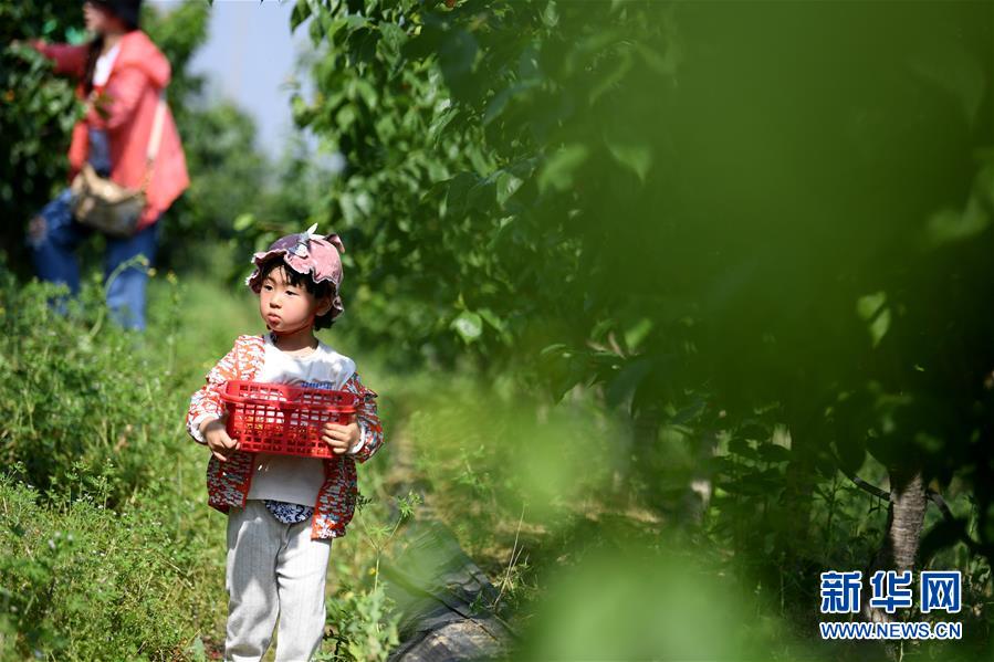 5月3日,游客在豐樂(lè)鎮(zhèn)鳳嶺苗木種植扶貧產(chǎn)業(yè)園里體驗(yàn)采摘櫻桃。新華社記者劉軍喜攝