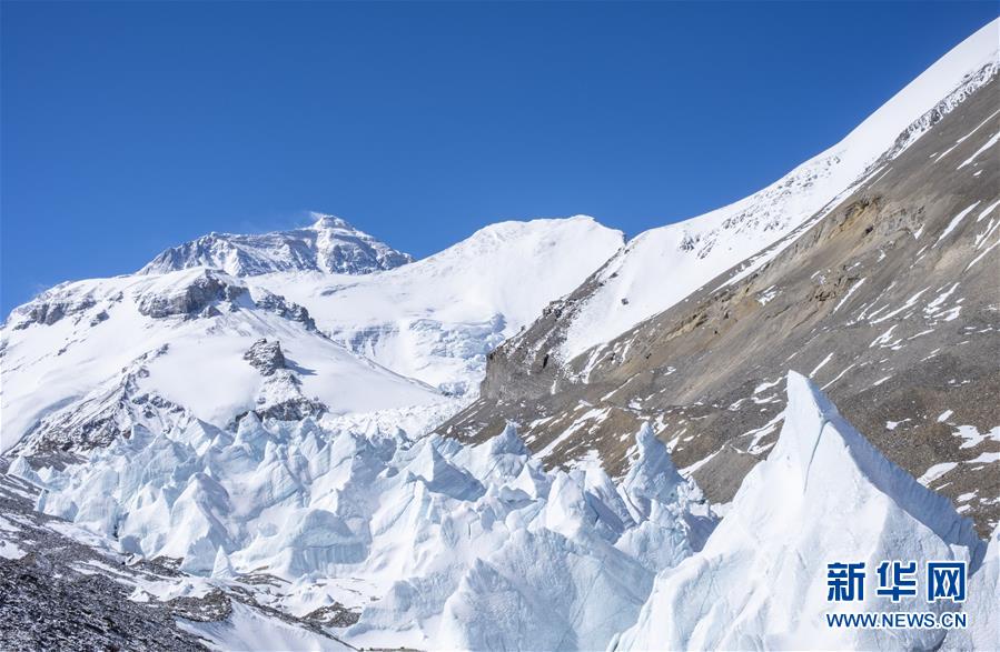 珠峰海拔5800米至海拔6500米的冰塔林(5月9日攝)。從海拔5800米的珠峰過渡營地到海拔6500米的前進營地,冰塔林沿山谷排列,蔚為壯觀。新華社記者孫非攝