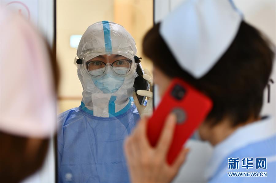 5月11日,在空港醫(yī)院的隔離病房,身處“紅區(qū)”的護(hù)士(中)和同事通話。新華社記者李然攝