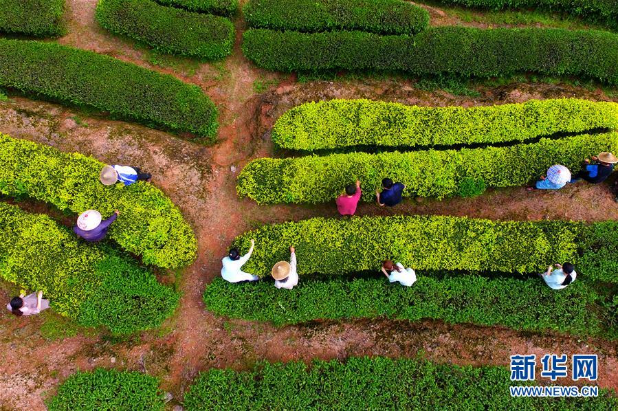 游玉瓊和方舟帶著公司員工抓緊采摘武夷巖茶中的白雞冠品種(無人機(jī)照片,5月10日攝)。新華社記者魏培全攝