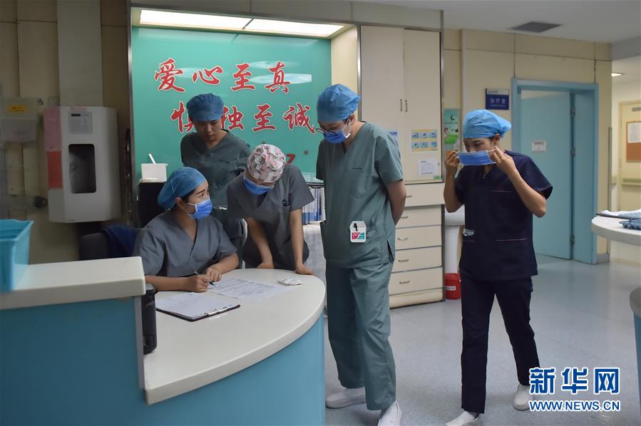 5月11日,在北京地壇醫(yī)院感染二科護(hù)士站,白班護(hù)士張莉(左一)和夜班護(hù)士們交接工作。北京地壇醫(yī)院是北京市收治新冠肺炎患者的定點(diǎn)醫(yī)院之一,醫(yī)院的醫(yī)護(hù)人員一直奮戰(zhàn)在抗擊疫情的一線。在國際護(hù)士節(jié)前夕,記者前往北京地壇醫(yī)院,記錄下抗疫一線護(hù)士的日常工作狀態(tài)。新華社記者彭子洋攝