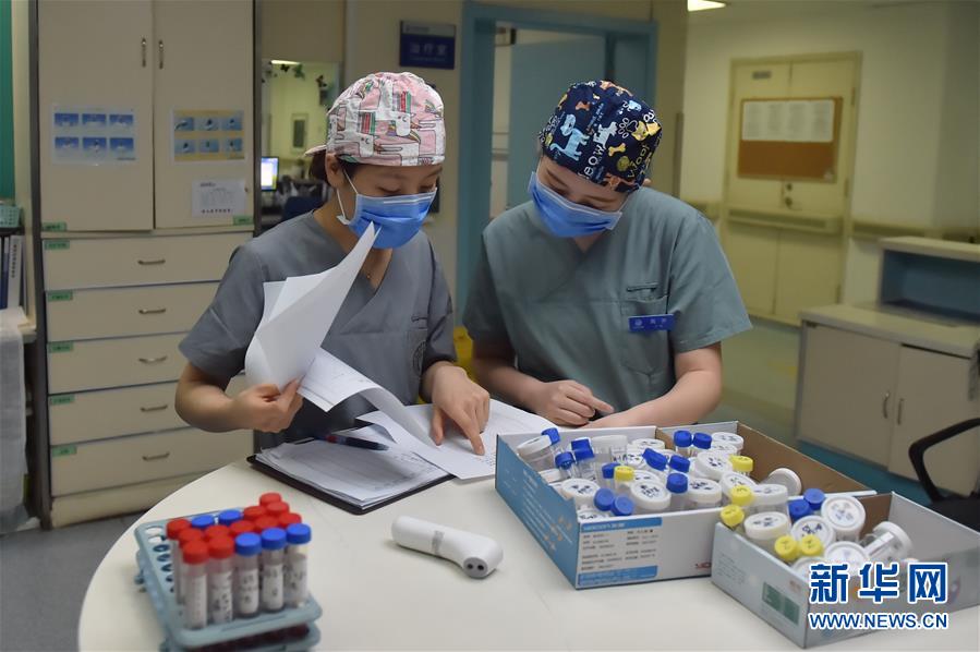 5月11日,在北京地壇醫(yī)院感染二科護(hù)士站,護(hù)士王蕊(左)和石淼在整理病人的核酸樣本。北京地壇醫(yī)院是北京市收治新冠肺炎患者的定點(diǎn)醫(yī)院之一,醫(yī)院的醫(yī)護(hù)人員一直奮戰(zhàn)在抗擊疫情的一線。在國際護(hù)士節(jié)前夕,記者前往北京地壇醫(yī)院,記錄下抗疫一線護(hù)士的日常工作狀態(tài)。新華社記者彭子洋攝