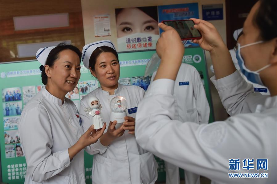 5月11日,在北京地壇醫(yī)院感染二科護(hù)士站,護(hù)士們被在護(hù)士節(jié)收到的禮物——天使玩偶所吸引。北京地壇醫(yī)院是北京市收治新冠肺炎患者的定點(diǎn)醫(yī)院之一,醫(yī)院的醫(yī)護(hù)人員一直奮戰(zhàn)在抗擊疫情的一線。在國際護(hù)士節(jié)前夕,記者前往北京地壇醫(yī)院,記錄下抗疫一線護(hù)士的日常工作狀態(tài)。新華社記者彭子洋攝