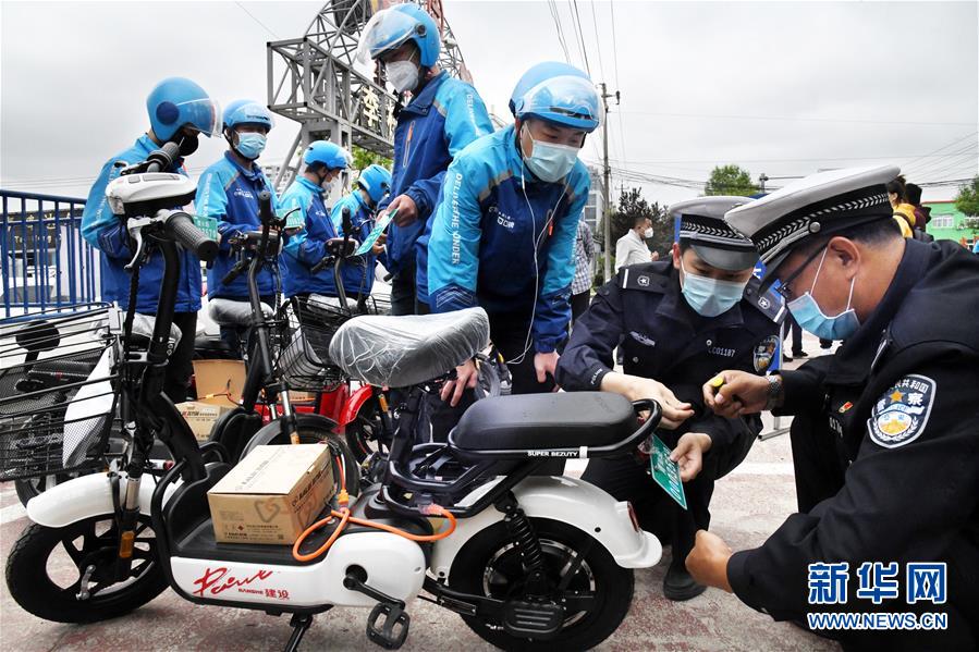 5月14日,青島市李滄交警部門(mén)民警為一外賣(mài)企業(yè)員工集中辦理電動(dòng)自行車掛牌。新華社記者李紫恒攝