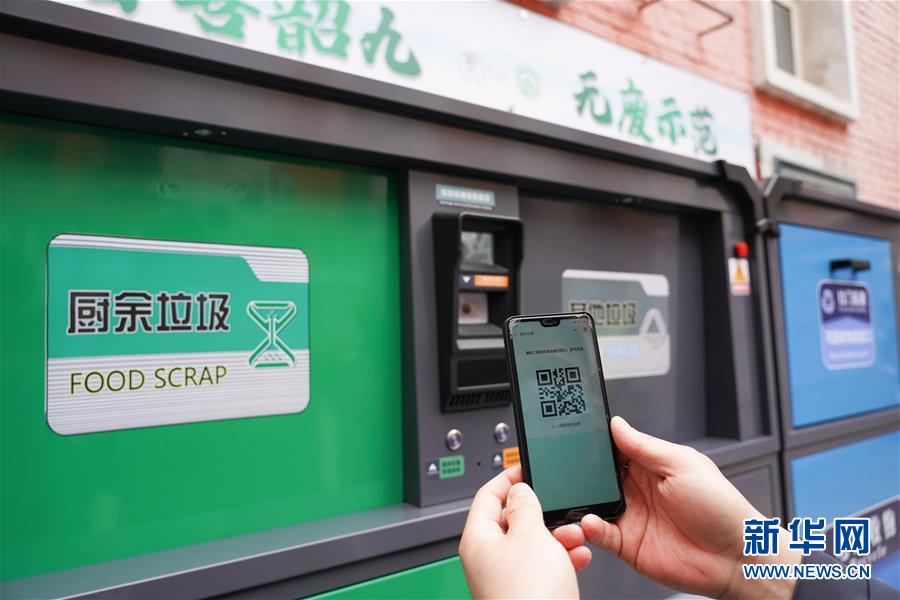 5月17日,在東華門街道韶九社區(qū),工作人員在展示用于垃圾分類投放和積分的二維碼。新華社記者鞠煥宗攝