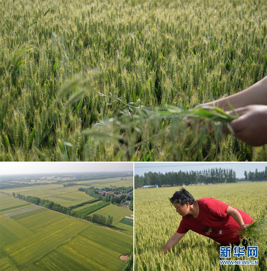 這是一張拼版照片(圖片均為5月16日攝)。上圖、下右圖:在河南省開封市尉氏縣十八里鎮(zhèn)趙崗村,村民郭菊在麥田內清除雜草。今年她家流轉土地種了18畝小麥,長勢良好。下左圖:尉氏縣十八里鎮(zhèn)趙崗村附近集中連片的麥田即將迎來收獲(無人機照片)。新華社記者孫清清攝