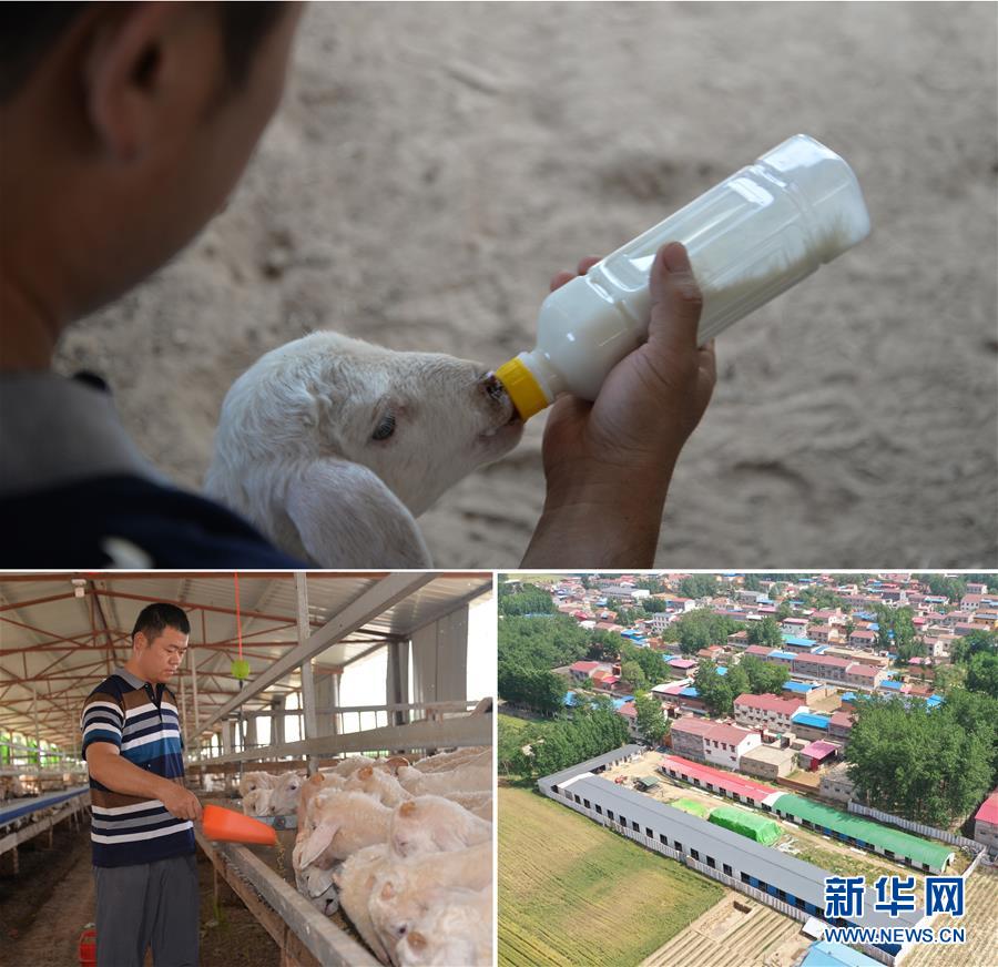 這是一張拼版照片(圖片均為5月16日攝)。上圖:在河南省開封市尉氏縣大橋鄉(xiāng)崗劉村,34歲的丁懿軍在給小羊喂奶;下左圖:丁懿軍在給羊喂食;下右圖:在扶貧政策扶持下,丁懿軍在村頭建了占地8畝的羊養(yǎng)殖場(chǎng),現(xiàn)養(yǎng)羊800多只(無人機(jī)照片)。新華社記者孫清清攝