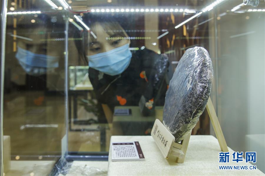 5月21日,在位于北京通惠河畔的中華古茶博物館,一名觀眾在首場(chǎng)展覽活動(dòng)——“大道遺真:館藏普洱茶專題展”上觀看一餅“號(hào)級(jí)茶”。 當(dāng)日,以“茶和世界 共品共享——茶,讓我們?cè)谝黄稹睘橹黝}的首個(gè)“國際茶日”萬里茶道系列活動(dòng)在北京中華古茶博物館開啟。 新華社記者 張玉薇 攝