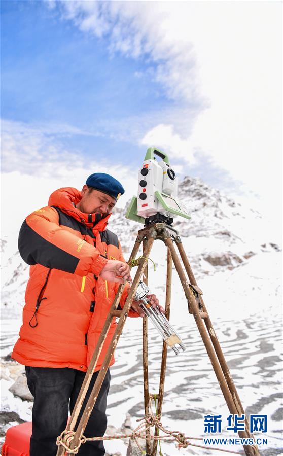 自然資源部第一大地測(cè)量隊(duì)隊(duì)員鄭林在使用全站儀對(duì)珠峰峰頂進(jìn)行交會(huì)觀測(cè)(5月27日攝)。新華社記者孫非攝