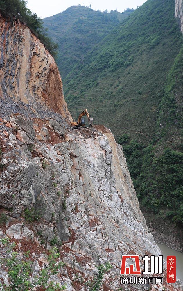 2020年5月27日,在貴州省畢節(jié)市納雍縣化作鄉(xiāng)雙巖頭村,挖掘機(jī)在觀音巖的懸崖邊修路。