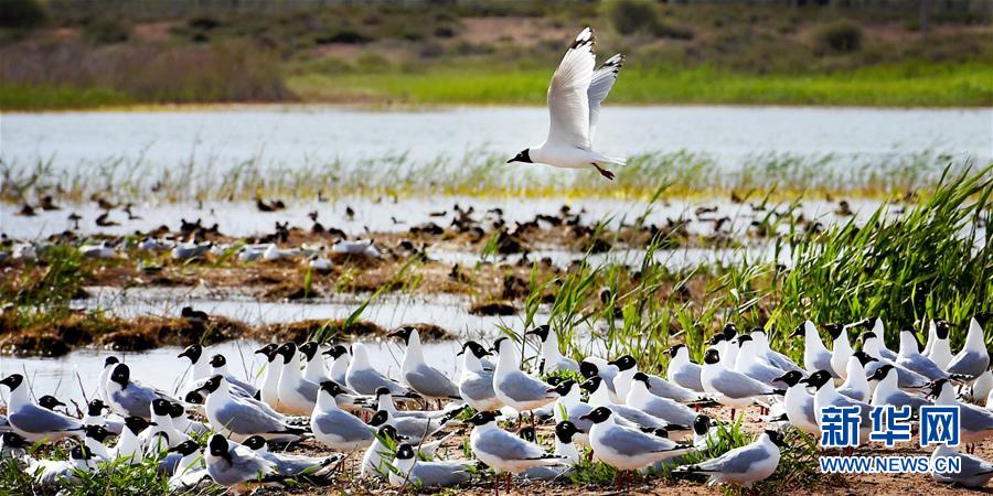 5月27日在陜西省神木市紅堿淖拍攝的遺鷗。陜西省神木市紅堿淖是中國最大的沙漠淡水湖,近年來隨著周邊生態(tài)環(huán)境改善,紅堿淖水位逐年提升,水域面積不斷擴(kuò)大,每年四至八月,都會(huì)吸引大批遺鷗來此繁衍棲息,已成為遺鷗繁殖的重要基地。新華社記者陶明攝