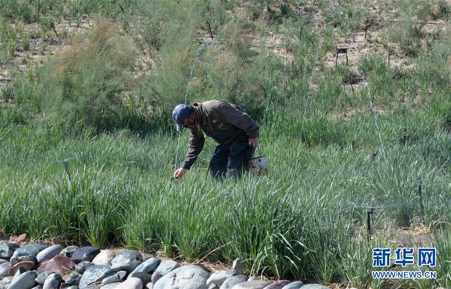 5月28日,工人在巴丹吉林鎮(zhèn)生態(tài)修復(fù)項(xiàng)目南部河道附近修理噴灌設(shè)備,以節(jié)約用水。2017年以來,內(nèi)蒙古阿拉善右旗在巴丹吉林鎮(zhèn)開展生態(tài)修復(fù)項(xiàng)目,種植適合在當(dāng)?shù)厣L的馬蓮、紅柳等植物,修復(fù)生態(tài)的同時(shí)也起到美化作用。巴丹吉林鎮(zhèn)是巴丹吉林沙漠旅游景區(qū)的游客集散地,這里常年干旱少雨,水資源匱乏。新華社記者徐欽攝