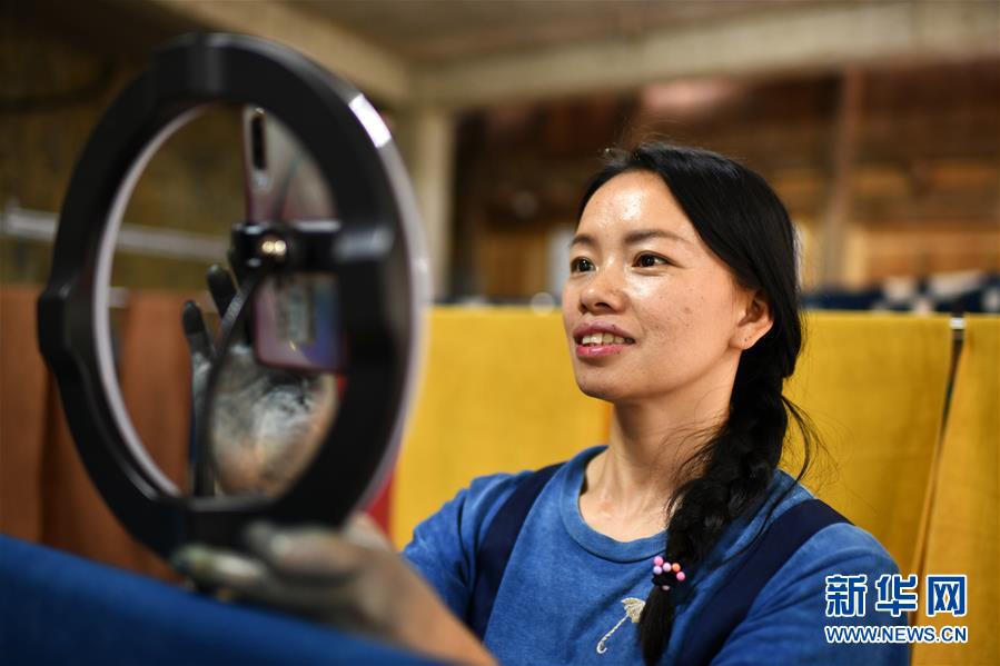 楊成蘭在用手機對侗族土布植物染色技藝進行網(wǎng)絡(luò)直播(5月28日攝)。