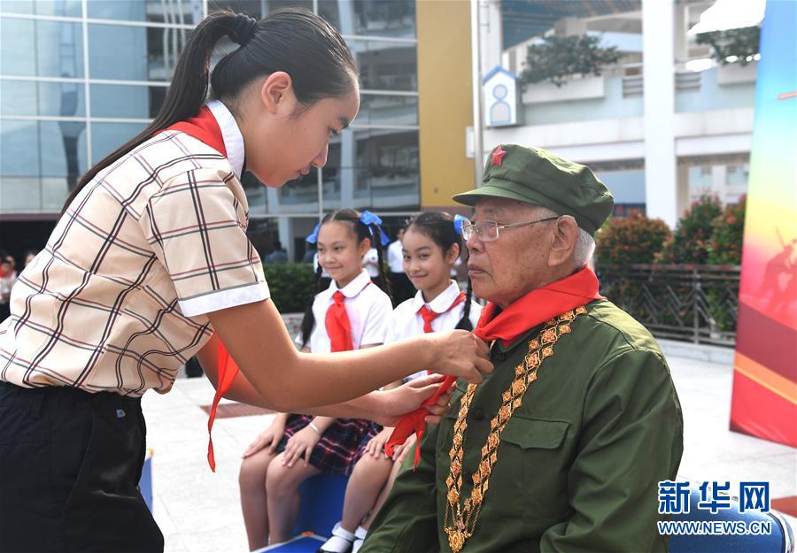 5月29日,少先隊(duì)員給李延年戴上紅領(lǐng)巾?!傲弧眹H兒童節(jié)來臨之際,“共和國勛章”獲得者、老一輩戰(zhàn)斗英雄李延年來到廣西南寧市濱湖路小學(xué)給孩子們講述戰(zhàn)爭(zhēng)年代的紅色故事,寄語他們好好學(xué)習(xí)、努力奮斗。孩子們向李延年贈(zèng)送了師生共繪的“紅色畫卷”,向老英雄致敬。新華社記者周華攝