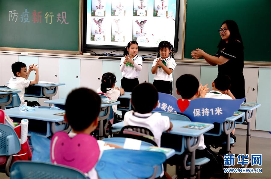 6月2日,上海閔行區(qū)鑫都小學(xué),老師指導(dǎo)一年級(jí)小學(xué)生如何正確洗手。當(dāng)日,上海小學(xué)一、二、三年級(jí)學(xué)生返校開(kāi)學(xué)。新華社記者張建松攝。
