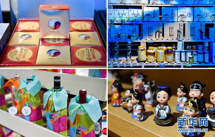 在延邊朝鮮族自治州和龍市“金達(dá)萊絲路”電商平臺(tái)實(shí)體店內(nèi)拍攝的帶有朝鮮族元素包裝的農(nóng)特產(chǎn)品及文創(chuàng)產(chǎn)品(拼版照片,5月7日攝)。新華社記者許暢攝。