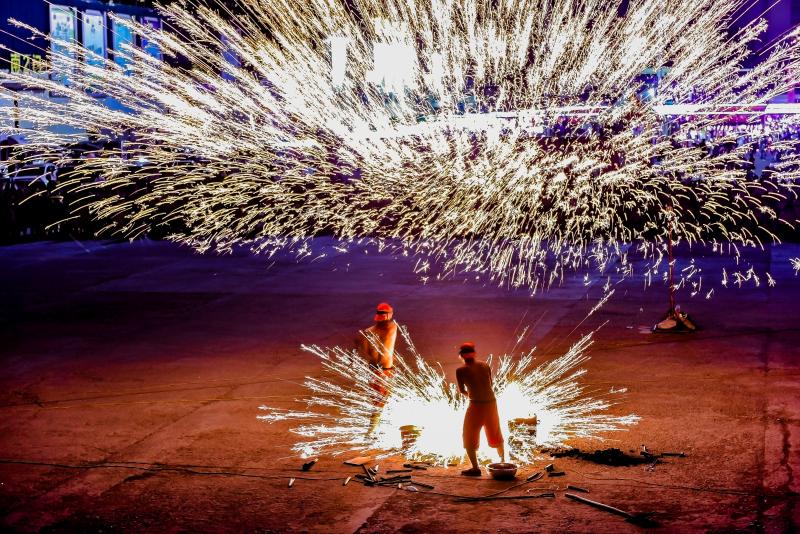 2020年6月7日晚8時許,吉林長春青岡立交橋附近,打鐵花時,先把熔好的鐵汁注入事先準(zhǔn)備好的“花棒”。一個拳頭粗細(xì)、一尺多長的柳樹棒,棒的頂端掏有直徑3厘米的圓形坑槽,用以盛放鐵汁。打鐵花者一手拿著盛有鐵汁的“花棒”,用下棒猛擊盛有鐵汁的上棒,使棒中鐵汁沖向花棚,鐵汁遇到棚頂?shù)牧Χ派⒊鼍薮蟮幕鸹āN宀世_紛、震天動地。