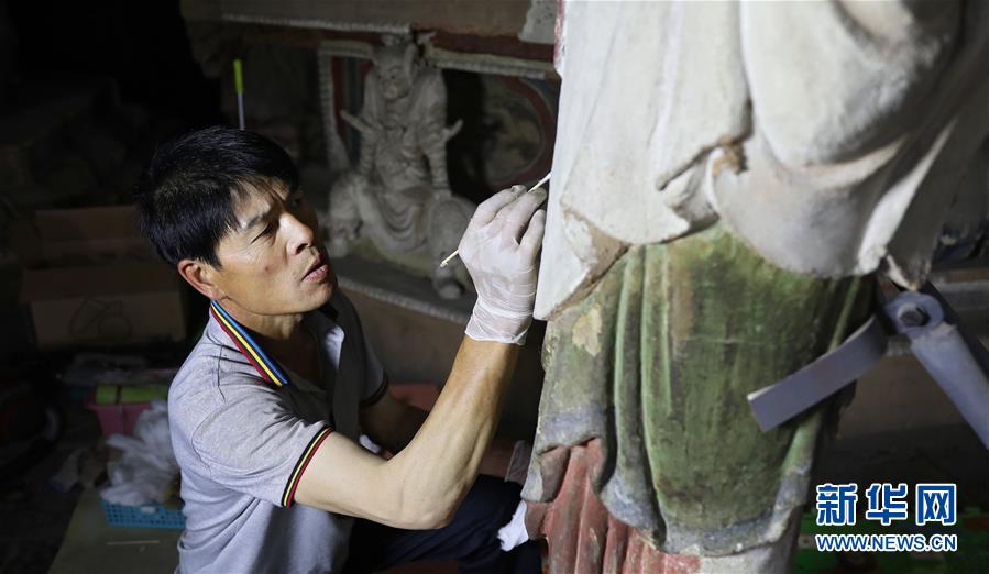 6月8日,工作人員對(duì)奉國(guó)寺的彩繪泥塑進(jìn)行保護(hù)修復(fù)。新華社記者姚劍鋒攝