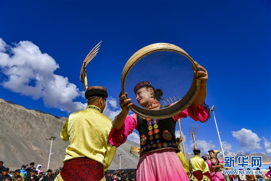 在熱斯喀木村,新疆塔什庫爾干塔吉克自治縣文工團演員為村民表演展示勞動生產(chǎn)場景的節(jié)目(6月6日攝)。新華社記者胡虎虎攝