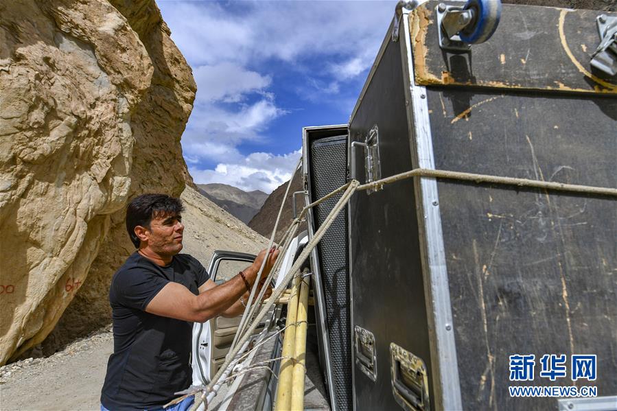 去往達(dá)布達(dá)爾鄉(xiāng)熱斯喀木村途中,塔縣文工團(tuán)演員拜合提亞爾·居馬汗在休息時(shí)加固車(chē)上的演出設(shè)備(6月5日攝)。新華社記者胡虎虎攝