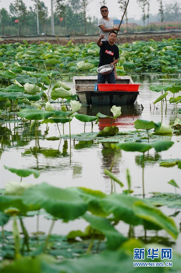 6月9日,在宿遷市宿城區(qū)中揚鎮(zhèn)一家淺水藕套養(yǎng)小龍蝦合作社,負責(zé)人王乃國(右)在取蝦苗(無人機照片)。新華社記者季春鵬攝