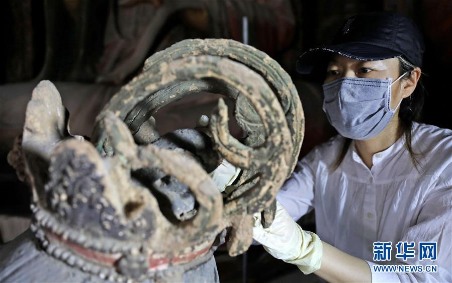 6月8日,工作人員對(duì)奉國(guó)寺的彩繪泥塑進(jìn)行保護(hù)修復(fù)。新華社記者 姚劍鋒 攝