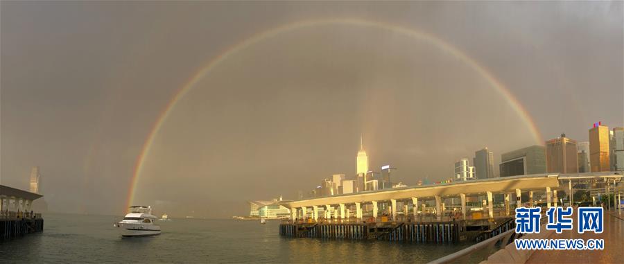 香港維多利亞港上空出現(xiàn)彩虹(6月16日攝)。6月16日傍晚,雨后的香港維多利亞港上空出現(xiàn)彩虹,美麗景色吸引市民駐足拍照。新華社記者 李鋼 攝