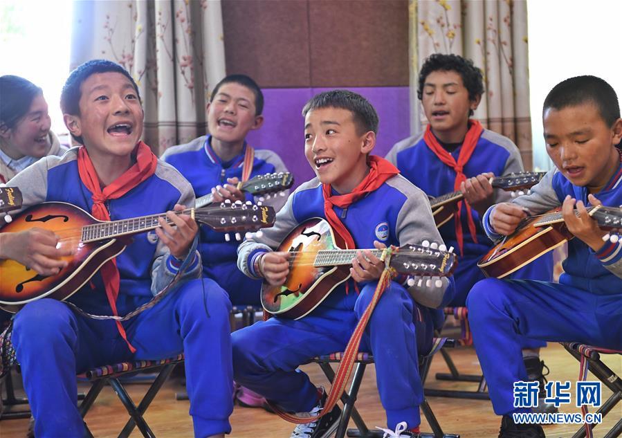 6月14日,孩子們在阿壩縣民族寄宿制小學(xué)內(nèi)的少年宮里用曼陀鈴進行彈唱。新華社記者 劉坤 攝
