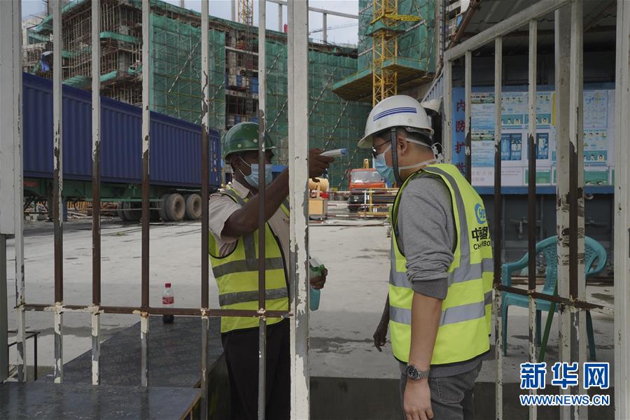 6月21日,在斯里蘭卡首都科倫坡,一名工人在中國港灣科倫坡房建項目工地門口接受體溫檢測。新華社記者唐璐攝