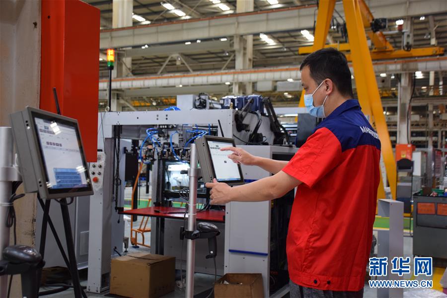 天津長榮科技集團(tuán)股份有限公司的工人在查看生產(chǎn)情況(6月18日攝)。新華社記者白佳麗攝
