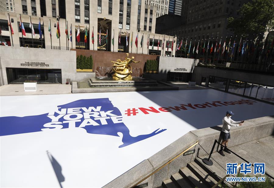 6月22日,在美國紐約洛克菲勒中心,一名男子在寫有“紐約堅強”字樣的廣場自拍。美國約翰斯·霍普金斯大學22日發(fā)布的新冠疫情最新統(tǒng)計數(shù)據(jù)顯示,美國累計死亡病例超過12萬例。新華社記者王迎攝