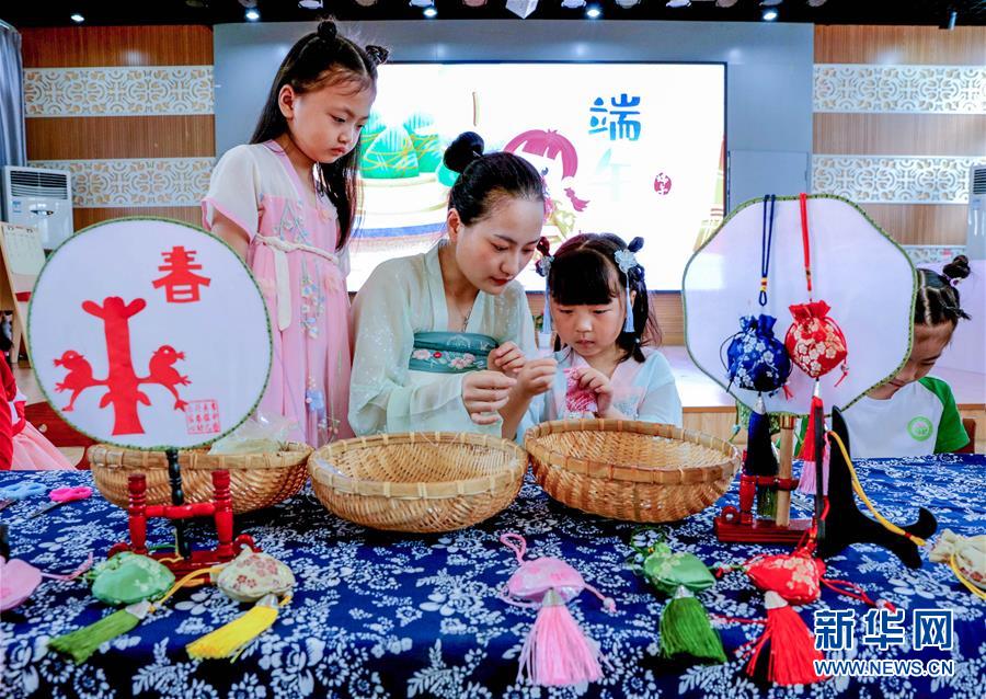 6月23日,長興縣李家巷鎮(zhèn)中心幼兒園的孩子們在老師的帶領下,一起制作端午香囊。為了迎接即將到來的端午節(jié),浙江省湖州市長興縣各個幼兒園開展“品民俗迎端午”主題活動,讓小朋友們體驗傳統(tǒng)民俗文化。新華社記者徐昱攝