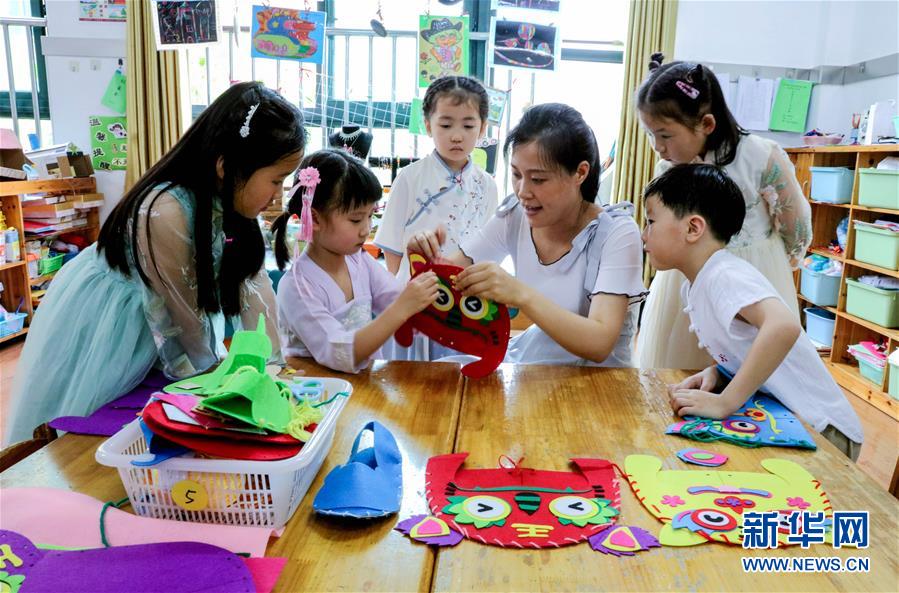 6月23日,長興縣開發(fā)區(qū)實驗幼兒園的孩子們在教師指導下學做虎頭鞋、虎頭帽。為了迎接即將到來的端午節(jié),浙江省湖州市長興縣各個幼兒園開展“品民俗迎端午”主題活動,讓小朋友們體驗傳統(tǒng)民俗文化。新華社記者徐昱攝