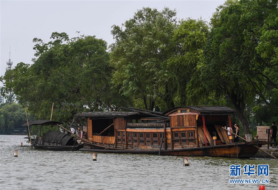 7月1日,嘉興南湖景區(qū)內(nèi)停泊的中共一大紀念船。新華社記者徐昱攝