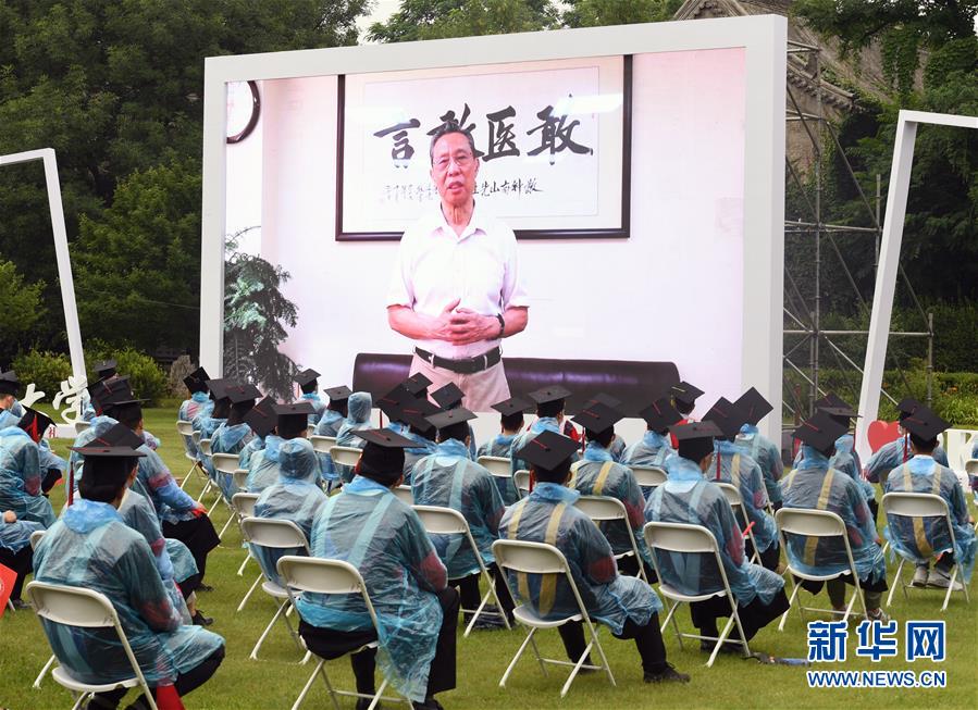 7月2日,2020屆畢業(yè)生在畢業(yè)典禮上觀看校友代表、國家呼吸系統(tǒng)疾病臨床醫(yī)學(xué)研究中心主任鐘南山發(fā)言視頻。當(dāng)日,北京大學(xué)舉行2020年畢業(yè)典禮。由于疫情防控需要,今年的典禮在北京大學(xué)辦公樓西側(cè)廣場、靜園草坪、未名湖等九個(gè)會(huì)場舉行,并面向全球進(jìn)行中英文雙語直播,僅部分在校畢業(yè)生現(xiàn)場參加,更多畢業(yè)生通過線上直播參與畢業(yè)典禮。新華社記者任超攝