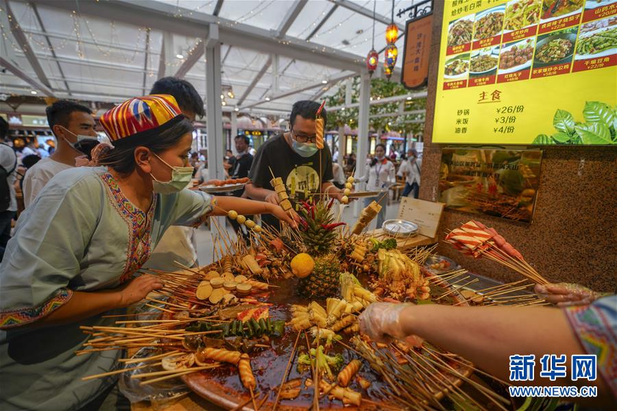 游客在烏魯木齊大巴扎景區(qū)挑選麻辣燙(7月4日攝)。夏日周末,烏魯木齊市大巴扎景區(qū)內(nèi)熙熙攘攘,人們來(lái)到這里品嘗美食、休閑購(gòu)物。2018年,經(jīng)過(guò)靚化改造后的大巴扎景區(qū)新增長(zhǎng)約800米的步行街,分為文創(chuàng)文旅和“非遺”項(xiàng)目街區(qū)、國(guó)際時(shí)尚街區(qū)和大巴扎美食街區(qū),是烏魯木齊最受歡迎的旅游目的地之一。新華社記者趙戈攝
