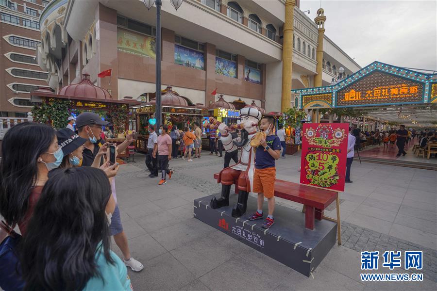 游客在烏魯木齊大巴扎美食街前拍照留念(7月4日攝)。夏日周末,烏魯木齊市大巴扎景區(qū)內(nèi)熙熙攘攘,人們來(lái)到這里品嘗美食、休閑購(gòu)物。2018年,經(jīng)過(guò)靚化改造后的大巴扎景區(qū)新增長(zhǎng)約800米的步行街,分為文創(chuàng)文旅和“非遺”項(xiàng)目街區(qū)、國(guó)際時(shí)尚街區(qū)和大巴扎美食街區(qū),是烏魯木齊最受歡迎的旅游目的地之一。新華社記者趙戈攝