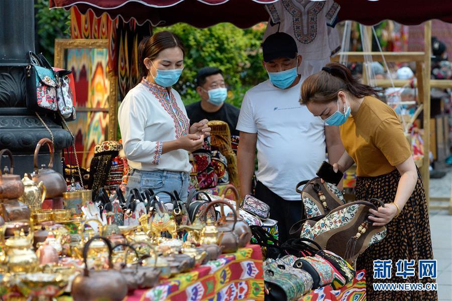 游客在烏魯木齊大巴扎景區(qū)選購(gòu)商品(7月4日攝)。夏日周末,烏魯木齊市大巴扎景區(qū)內(nèi)熙熙攘攘,人們來(lái)到這里品嘗美食、休閑購(gòu)物。2018年,經(jīng)過(guò)靚化改造后的大巴扎景區(qū)新增長(zhǎng)約800米的步行街,分為文創(chuàng)文旅和“非遺”項(xiàng)目街區(qū)、國(guó)際時(shí)尚街區(qū)和大巴扎美食街區(qū),是烏魯木齊最受歡迎的旅游目的地之一。新華社記者丁磊攝
