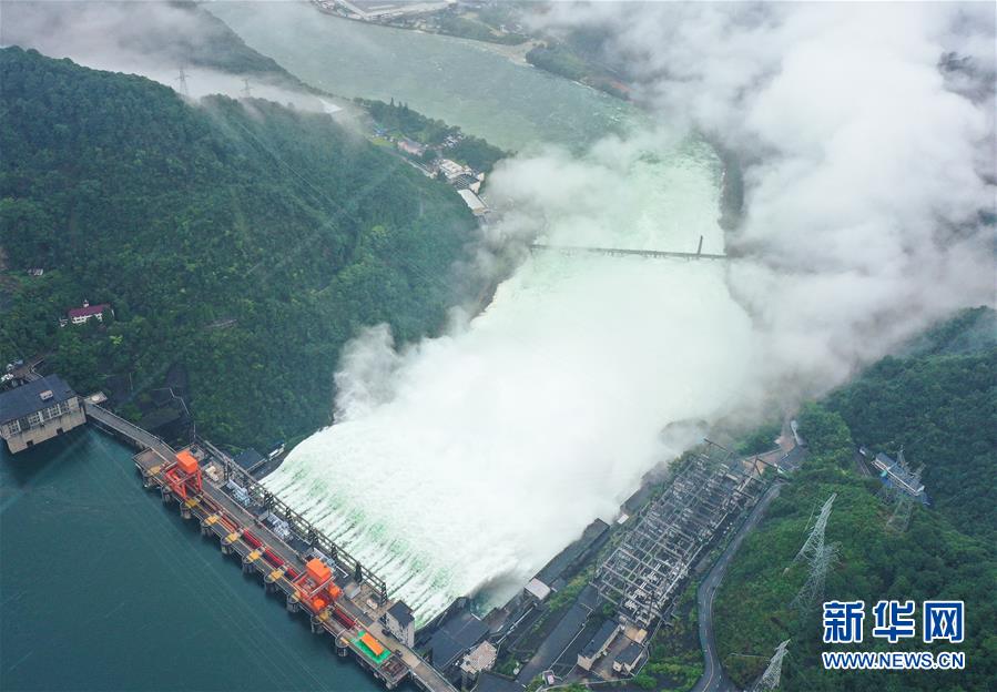 7月8日開啟9孔泄洪的新安江水庫(無人機(jī)照片)。新華社記者翁忻旸攝
