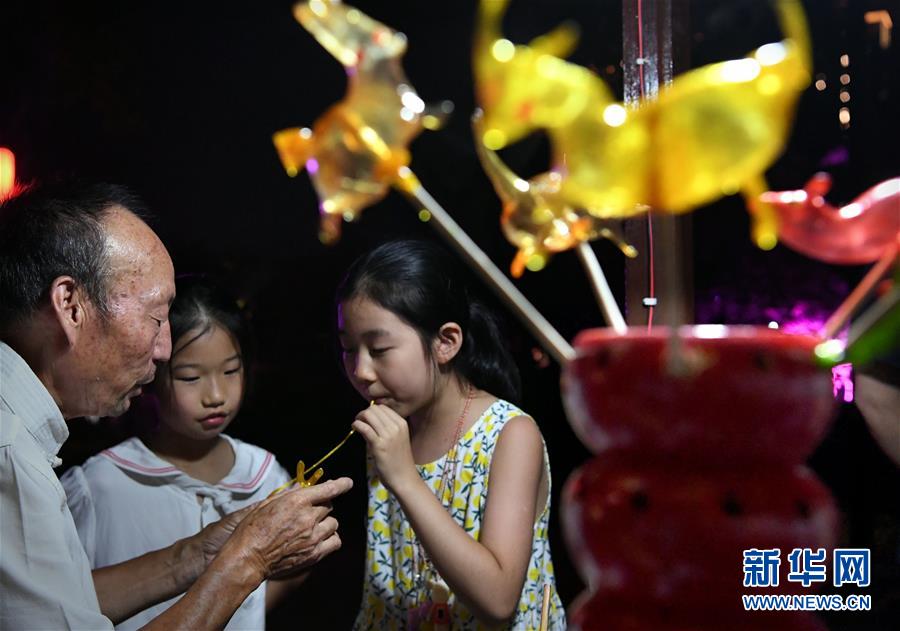 7月7日晚,小朋友在洛陽洛邑古城內吹糖人。近日,河南洛陽的夜晚愈發(fā)繽紛多彩。立足于厚重的隋唐文化底蘊,洛陽正通過創(chuàng)新夜游產品打響“古都夜八點”品牌,激活文旅消費。新華社記者李安攝