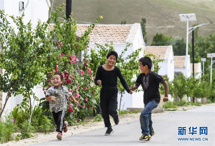 在新疆特克斯縣境內的牧民定居點,小朋友在巷道內追逐玩耍(7月6日攝)。新華社記者王菲攝