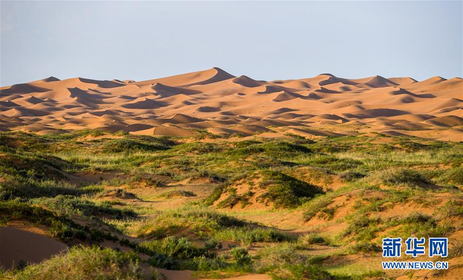 這是7月8日拍攝的騰格里沙漠風(fēng)光。位于內(nèi)蒙古自治區(qū)阿拉善左旗西南部和甘肅省中部邊境的騰格里沙漠是我國(guó)第四大沙漠,總面積約為4.3萬平方公里。夏日傍晚,騰格里沙漠連綿的沙丘被日光勾勒出美麗的線條,美不勝收。新華社記者連振攝