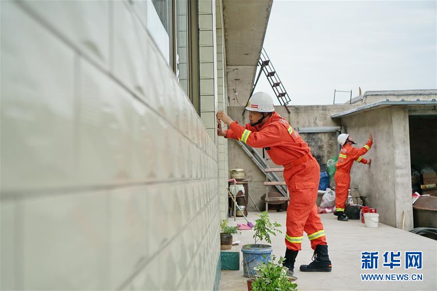 7月12日,消防救援人員在河北省唐山市古冶區(qū)卑家店鎮(zhèn)前巍峰山村村民家中排查。新華社記者 牟宇 攝