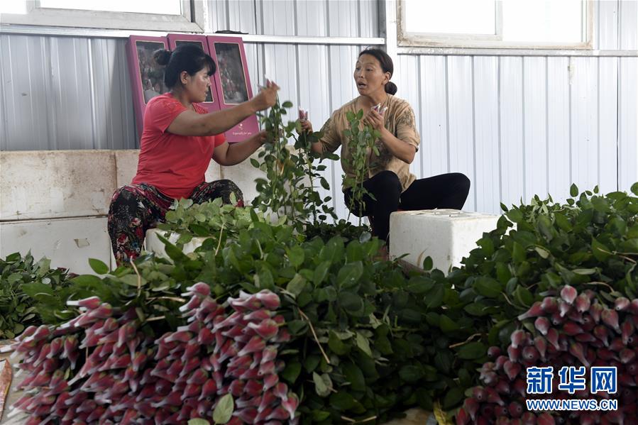 7月10日,莒縣招賢鎮(zhèn)西黃埠村盛世花卉種植專業(yè)合作社工人在包裝玫瑰花。山東省日照市莒縣招賢鎮(zhèn)有20余年的玫瑰花、扶郎花種植歷史。目前,招賢鎮(zhèn)投資建設(shè)的高標(biāo)準(zhǔn)特色鮮花種植大棚可年產(chǎn)700-800萬(wàn)枝優(yōu)質(zhì)玫瑰和扶郎花等,帶動(dòng)周邊鄉(xiāng)鎮(zhèn)的建檔立卡貧困戶脫貧增收。新華社記者 范長(zhǎng)國(guó) 攝