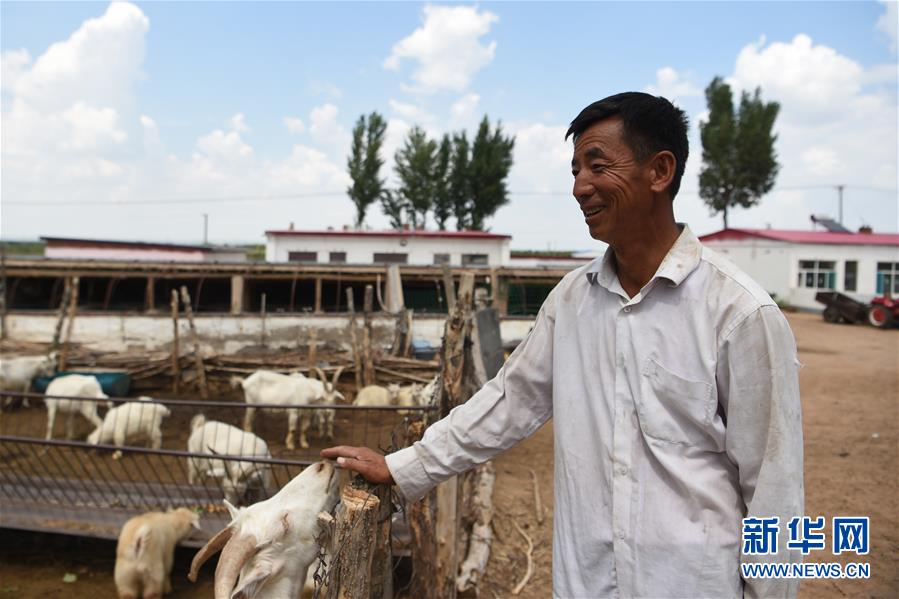 7月14日,高二仁看著自家養(yǎng)的羊露出笑容。新華社記者 李志鵬 攝