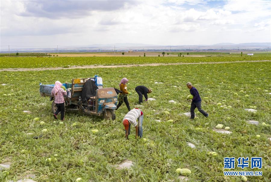 7月16日,在寧夏中衛(wèi)市香山鄉(xiāng)硒砂瓜萬(wàn)畝示范基地,瓜農(nóng)將采收的西瓜裝車(無(wú)人機(jī)照片)。近日,寧夏中衛(wèi)市迎來(lái)硒砂瓜豐收季。硒砂瓜是中衛(wèi)市的特色農(nóng)產(chǎn)品,近年來(lái),當(dāng)?shù)夭扇〖夹g(shù)創(chuàng)新、規(guī)?;N植、休耕輪作等多項(xiàng)舉措,讓硒砂瓜種植成為當(dāng)?shù)剞r(nóng)民增收致富的重要產(chǎn)業(yè)。據(jù)了解,今年中衛(wèi)市硒砂瓜種植面積為69.7萬(wàn)畝。新華社記者楊植森攝